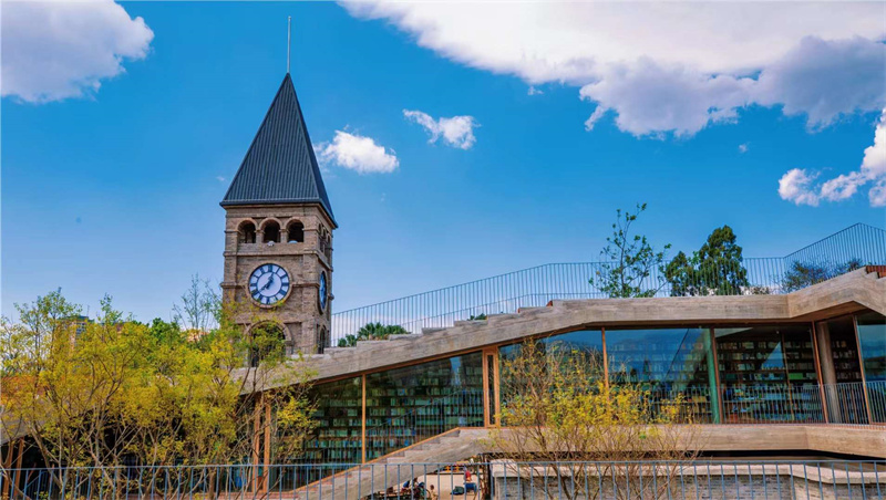 南湖畔,钟楼巍巍。这座由建筑师张轲设计的书店,保留了老钟楼与砖房,爬上钟楼的旋转楼梯,南湖就在脚下。