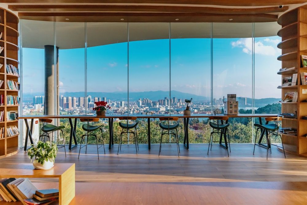 书吧共有2500平方米,分上下2层,可容纳100余人同时阅读,透过明净的玻璃窗,可俯瞰整个弥勒城,山水、建筑、云影,皆成画卷。