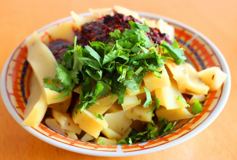 峨山舂菜的品类多样,舂肉、舂鱼、舂豆、舂菌子、舂蔬菜……“舂”无处不在,看似粗犷干脆的动作,却暗含着细腻柔韧的技巧。在峨山,无人不晓的舂菜莫过于舂鸡,而峨山舂鸡又以小街镇最为出名。舂鸡因加入了峨山本地大香椿籽面、花生等调料,味道独特,麻、辣、香等味渐渐融入清甜鸡肉之中,吃起来麻辣爽口。