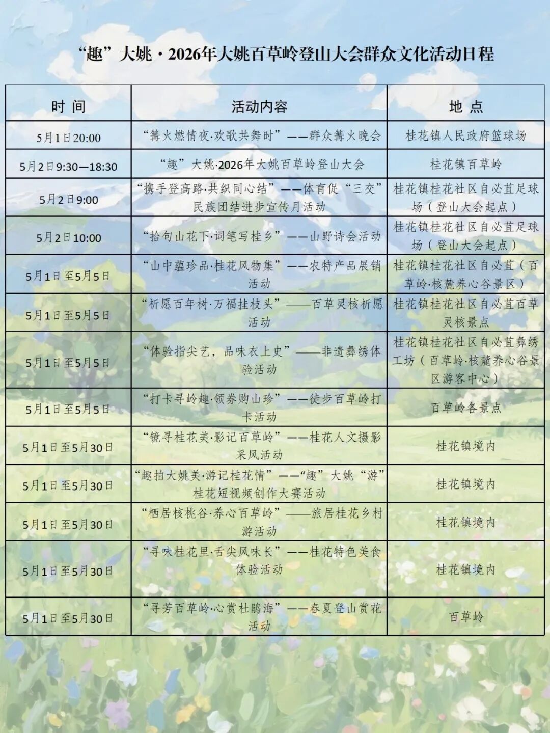 5月1日至5月30日,“趣”大姚·2026年大姚百草岭登山大会群众文化活动将陆续开展,这是一场藏在大山深处的体育盛会,更是一次奔赴春日巅峰的浪漫征途,山花松涛伴你攀登,山风云海为你喝彩。