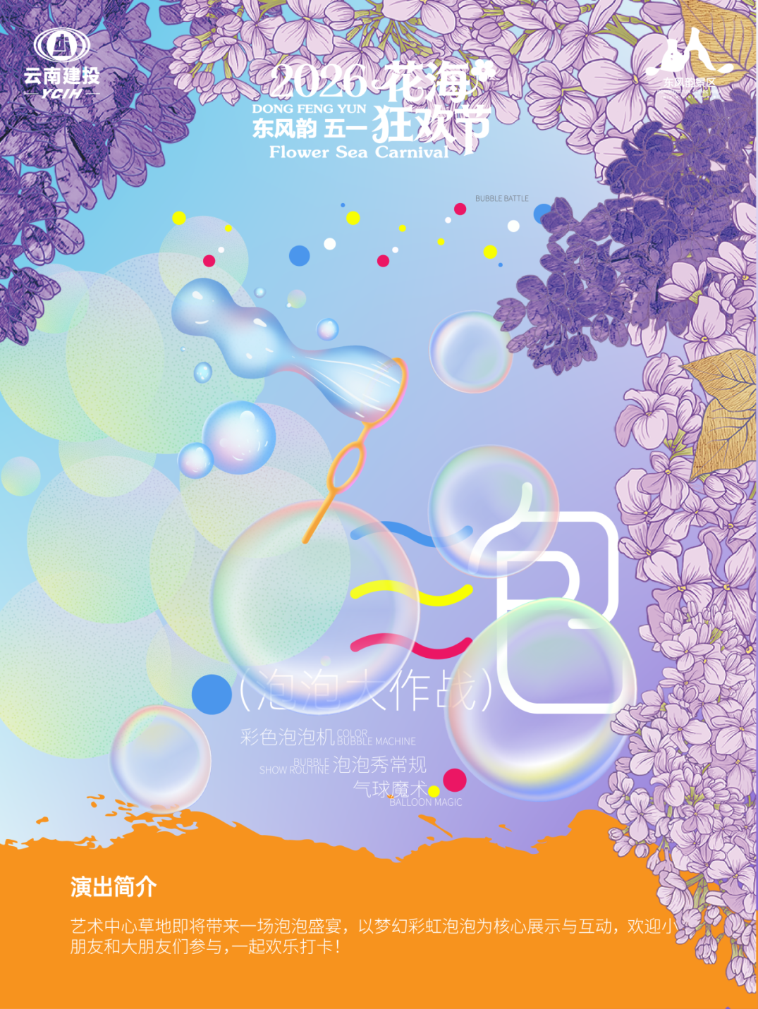 艺术中心草地即将带来一场泡泡盛宴,漫天彩虹泡泡从天而降,在泡泡海洋里奔跑、欢笑、追逐吧。