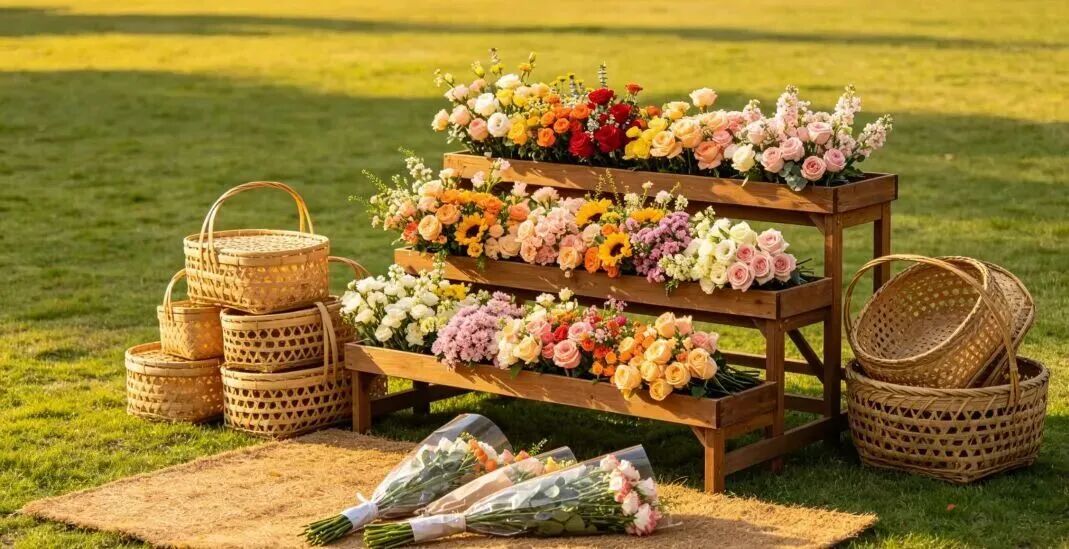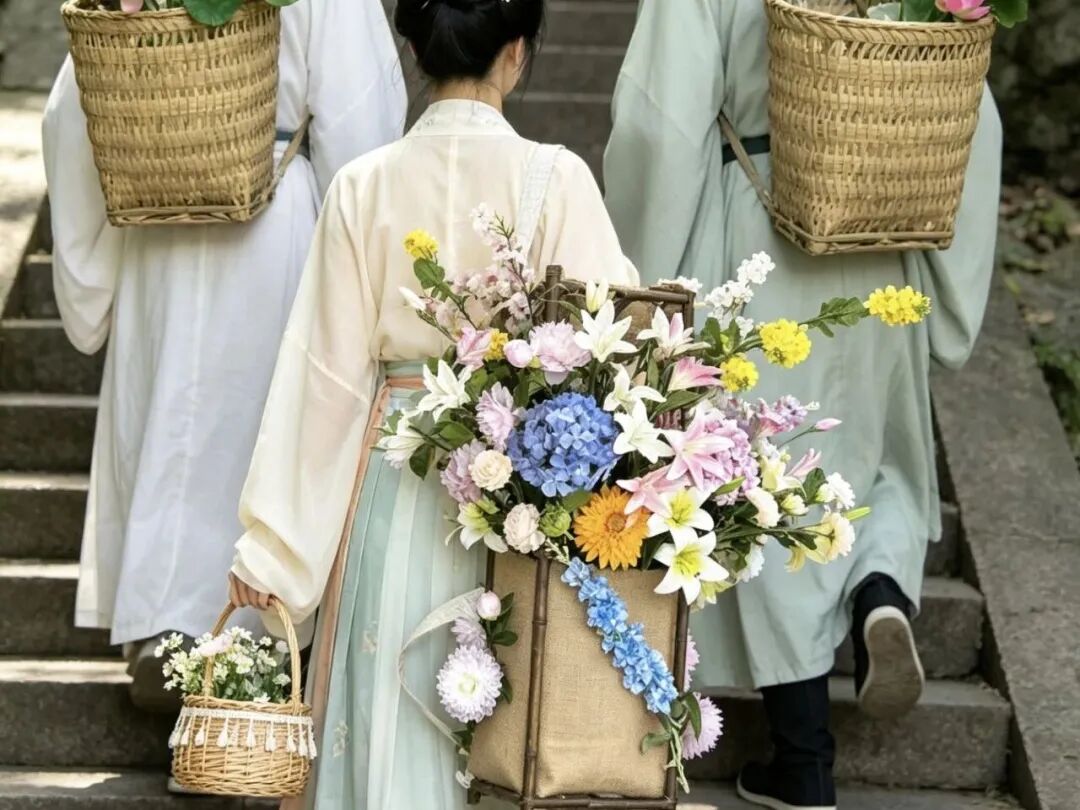古风书生和花仙子在山间巡游,背着背篓、提着花篮,遇到你就递上一枝鲜花。