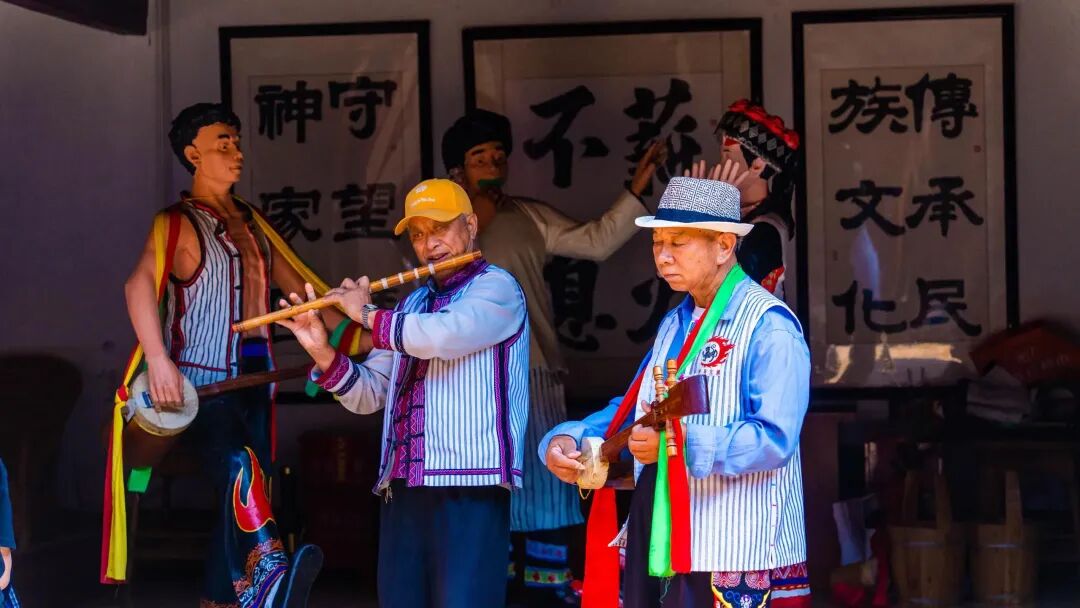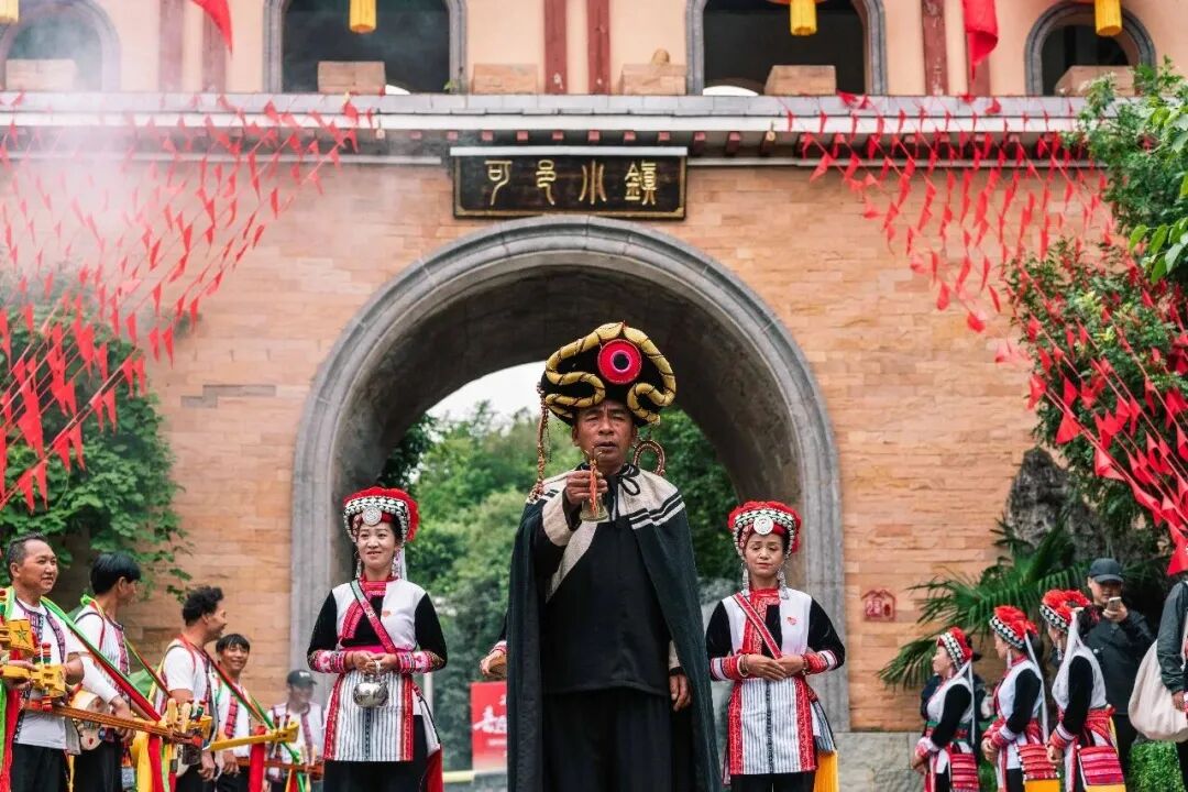 热情阿细青年男女身着盛装,吹奏传统乐器(大三弦、竹笛),跳迎宾舞,邀请游客品尝地道美酒,共醉于醇厚民族风情。