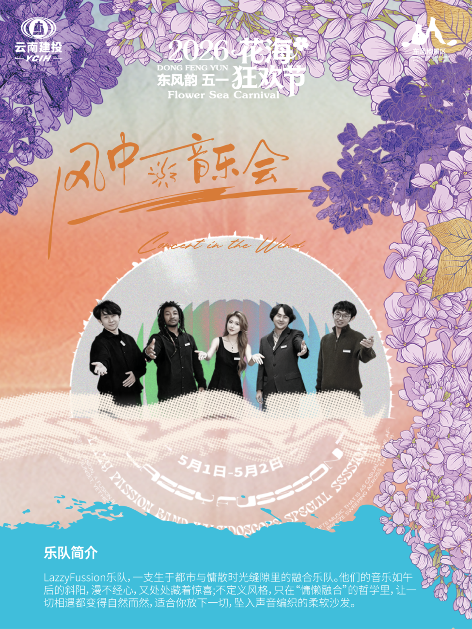 活动时间:5月1日至5月2日13:00—13:30,15:00—15:30,17:00—17:30(Lazzy fusion乐队);
