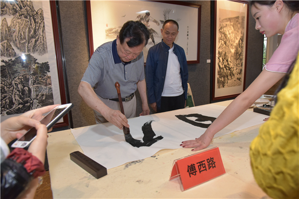 现场,傅西路等知名书画家题字、作画切磋交流,把活动推向高潮。傅西路书写的“日月方圆”四字,更是引起书画家们的关注。傅西路的书法大气磅礴,融入了博大精深的汉字智慧,还有大气厚重的精气魂在其中。虽然年过8旬,但傅西路圆润灵活而又平稳的运笔,中速均匀、不激不厉、从容有节制的行笔,在微妙的夸张中富有变化,气韵连贯,内蕴魅力,给人醇厚典雅的视角美感。